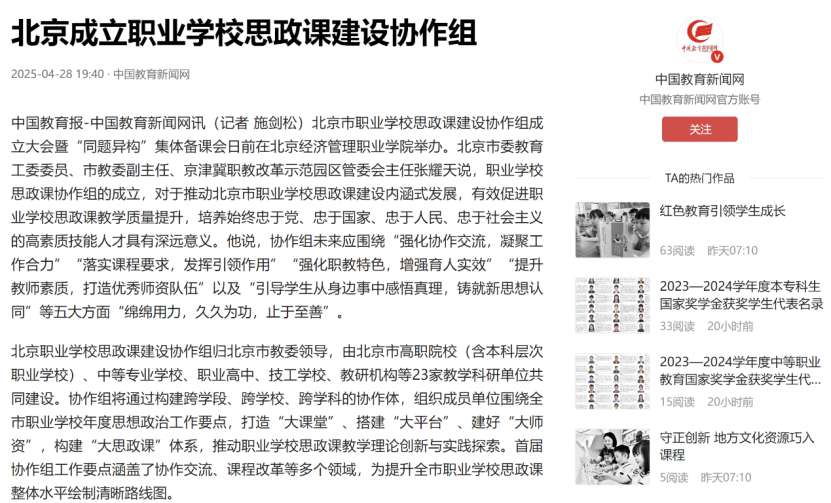 1.中国教育报、中国青年报等主流媒体持续关注北京市职业学校思政课建设协作组成立据…