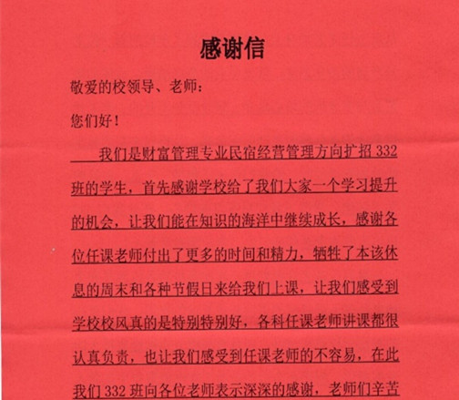 近日,数字财金学院收到一封来自财富管理(民宿经营管理)专业2021021332班全体学生…