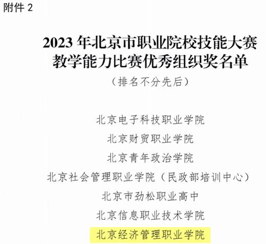 近日,北京市教委发布了《北京市教育委员会关于公布2023年北京市职业院校技能大赛教学能力比赛获奖结果的通知》,bat365在线平台10支参赛团队,共获得3个一等奖、4个二等奖、3个三等奖,学校还连续3年获得优秀组织奖!