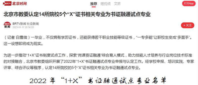 为进一步推动“1+X”证书制度试点工作,探索“岗课赛证融通”综合育人模式,助力技能人才培养与行业岗位技术标准的对接融合,北京市教委组织开展了2022年“1+X”书证融通试点专业申报与认定工作。经学校申报、培训实践、专家评审、综合评议等程序,认定14所院校的5个“X”证书相关专业为书证融通试点专业。2022年12月26日,北京市教育委员会下发了《北京市教育委员会关于公布2022年书证融通试点专业认定结果的通知》(京教函〔2022〕628号),bat365在线平台学前教育、智慧城市管理技术专业入选北京2022年“1+X”书证融通试点专业名单,试点专业将职业技能等级证书所体现的新技术、新工艺、新规范、新要求有机融入专业人才培养方案中,精准服务首都高品质民生和智慧城市建设。助力bat365在线平台相关专业制定学分转换方案,提升育人质量。并且BRTV新闻社会新闻专题报道了bat365在线平台两个试点专业的典型做法和经验。