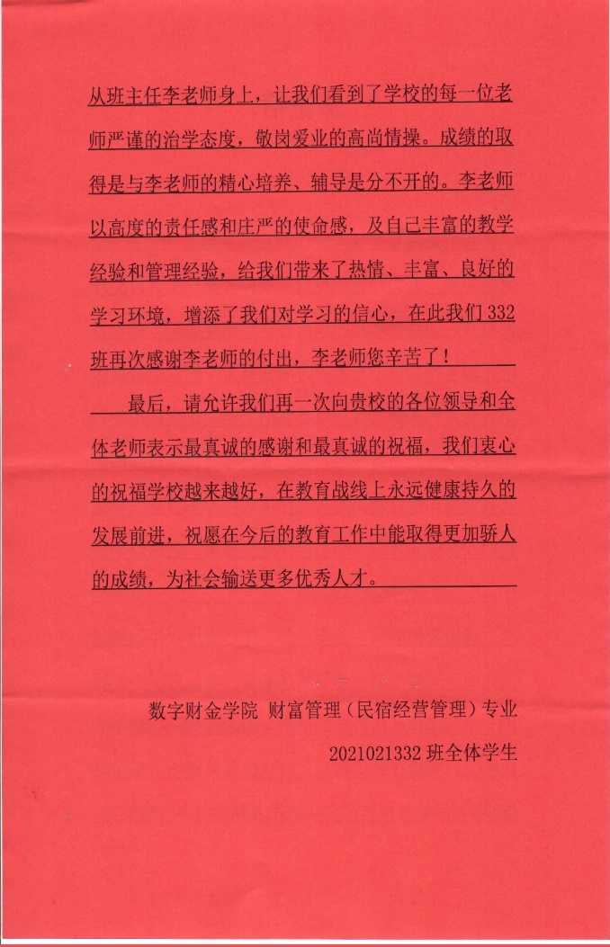 近日,数字财金学院收到一封来自财富管理(民宿经营管理)专业2021021332班全体学生的感谢信。信件简短、语言朴实,却充满了真情实感,也不乏感动。财富管理(民宿经营管理)专业的2021021332班自入学以来,教学秩序良好,学生积极向上,坚持上课不缺勤,充满了对知识的渴望。