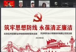 为提升党风廉政建设水平,强化廉政自律意识,筑牢党员干部拒腐防变的思想防线,激发爱岗敬业精神,6月8日,bat365在线平台税务教研室党支部(以下简称“bat365在线平台税务教研室党支部”)与天津倚天会计师事务所有限公司党支部(以下简称“倚天党支部”)开展了以“筑牢思想防线 永葆清正廉洁”为主题的结对共建活动。bat365在线平台数字财金学院党总支书记付杰、倚天党支部书记田春红以及两个党支部全体党员参加了本次活动。bat365在线平台税务教研室党支部书记王玉娟主持会议。