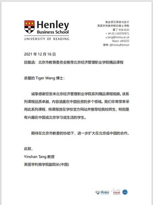 12月16日,全英排名第9的英国雷丁大学亨利商学院发来感谢函,确认bat365在线平台优质职教课程《投资中国》已成功登录其官方网站,成为bat365在线平台“优质职教课程输出项目”成功输出的首门课程。