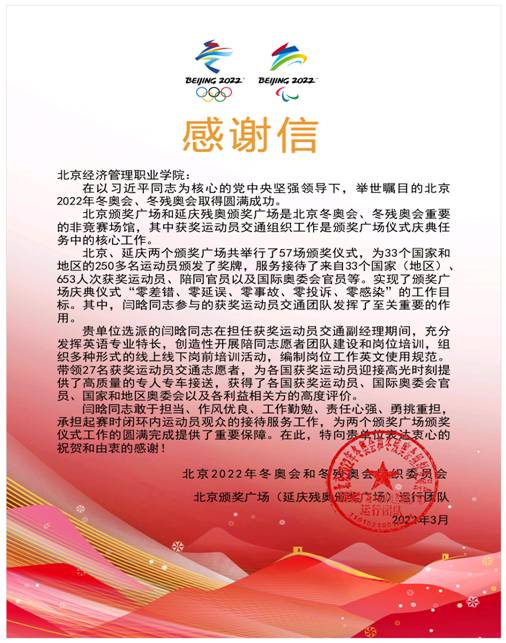 在以习近平同志为核心的党中央坚强领导下,举世瞩目的北京2022年冬奥会、冬残奥会取得圆满成功。近期,学校收到北京冬奥组委发来的感谢信,对闫晗老师圆满完成冬奥会、冬残奥会服务保障任务给予了充分肯定,并表示由衷的感谢。