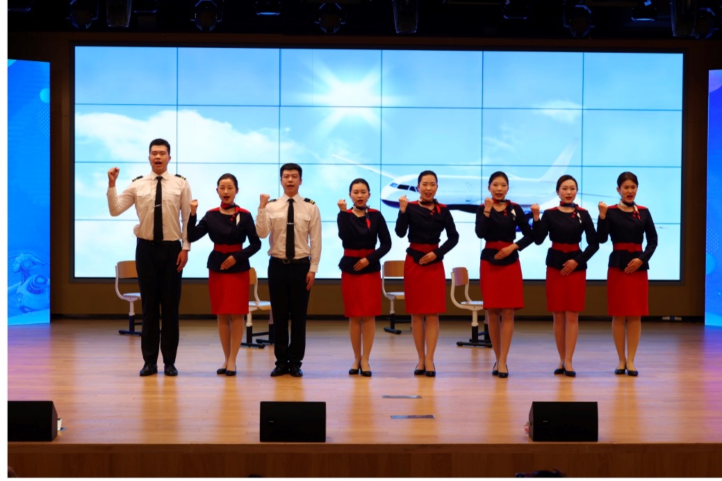 开幕式的最后,学校师生现场进行了系列技艺技能展演。工程技术学院应用电子技术专业的学生为大家表演了智能机器人装调技能,机器人在学生的遥控下唱歌、跳舞,表现出了学生们熟练地技能操作和扎实的理论功底;珠宝与艺术设计学院学生们身穿汉服霓裳,依次上台为观众展示学生作品,表现了来自珠宝学子中国传统手工工艺制品的魅力;管理学院的空中乘务专业以民航服务岗位对良好形象、礼仪素质及安全应急技能所提出的高标准要求为基础,展示了民航形体规范、服务礼仪和客舱应急处置技能,体现出国门服务良好的精神面貌和职业素养,彰显了空中乘务专业校企深度融合的办学成果。