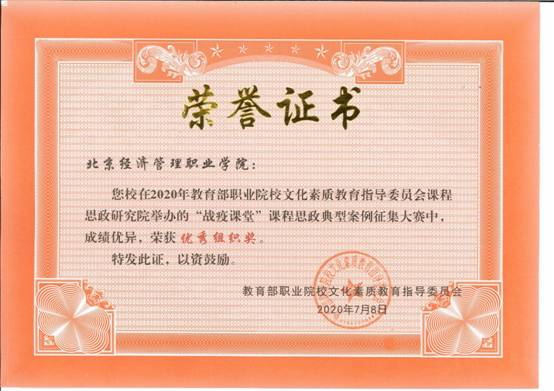 bat365在线平台荣获2020年全国职业院校“战疫课堂”课程思政典型案例优秀组织奖