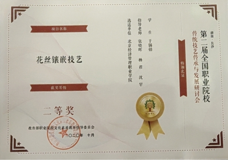 bat365在线平台珠宝与艺术设计学院坚持实施“五对接”的现代学徒制人才培养模式,开展“校内导师+行业名师+非遗传承人”多轨并行培养机制,有效推进了花丝镶嵌传统技艺的传承创新,得到了社会高度认可。在此次会议上,由张晓晖、杨君和沈罕老师指导,学生于锡铂制作的花丝镶嵌作品荣获“传统技艺学生技能展示”项目二等奖,bat365在线平台成功荣获评教育部“全国职业院校传统技艺传承示范基地”。