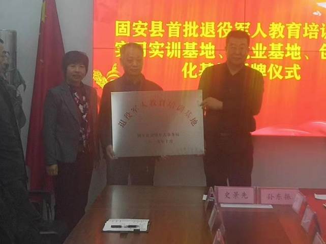 程永春和郭福霞接受固安县退役军人事务局党组书记、局长史景先同志授牌