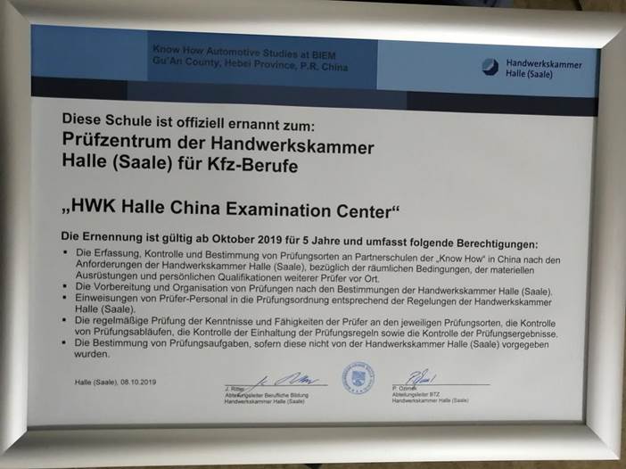 2019年10月15日至18日,学校副院长魏中龙代表学校参加了在广东佛山举办的“2019中国新能源及智能网联汽车职业教育产教融合论坛”。全国政协委员、中国职业技术教育学会会长、教育部原副部长鲁昕、教育部职业技术教育中心研究所研究员姜大源、德国DCG德中协会国际学院院长Hans-Gerog Kern等专家作了专题报告。德国HWK Halle手工业协会为bat365在线平台进行了授牌仪式。