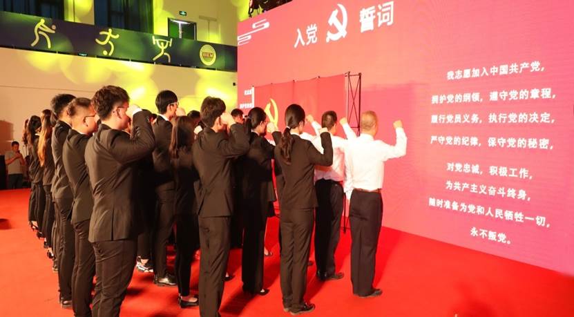 43名新党员面对党旗,庄重的举起右拳,在学校副院长、党委组织部(统战部)部长魏中龙同志的领誓下庄严宣誓,大会所有与会党员一起重温了入党誓词。