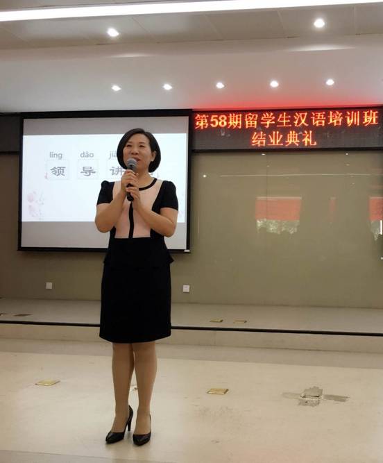 彭彧华副院长在致辞中向本学期顺利结业的全体同学表示祝贺,并肯定了大家的进步和成绩,鼓励国际学生继续努力学好汉语,成为和平的使者和友谊的桥梁。