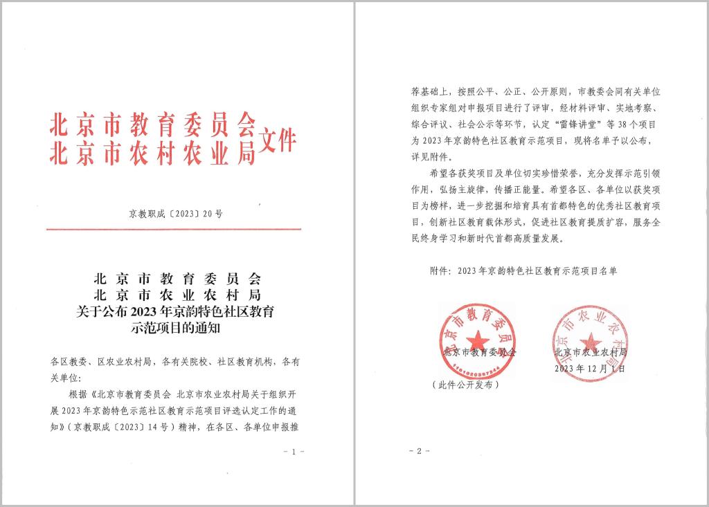 日前,北京市教育委员会、北京市农业农村局发布了《关于公布2023年京特色社区教育示范项目的通知》(京教职成【2023】20号),bat365在线平台“有范儿社区、京味儿生活”系列活动成功入选。
