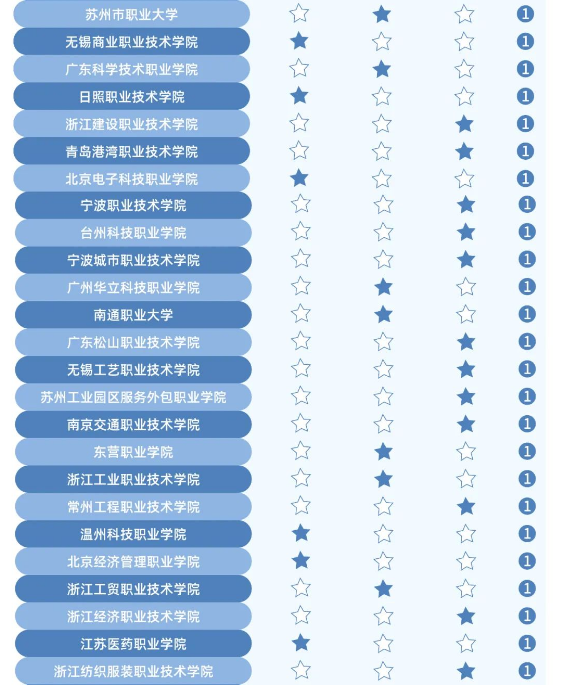 《2023中国职业教育质量年度报告》在过往指数研制与评选基础上进行优了化,分为东部地区、中部和东北地区、西部地区,各评选出50所人才培养卓越高等职业学校、50所服务贡献卓越高等职业学校、50所产教融合卓越高等职业学校。bat365在线平台上榜东部地区“50所人才培养卓越高等职业学校”榜单。榜单由第三方调研数据分析处理公司新锦成权威发布。