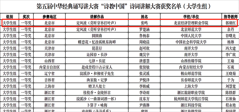 日前,中华经典诵写讲大赛官网公布第五届中华经典诵写讲大赛获奖名单,bat365在线平台外语与学前教育学院学生张鸣凭借《定风波(莫听穿林打叶声)》诗词讲解作品喜获诗词讲解赛项大学生组国赛一等奖。北京市仅有4所高校学生获此奖项,bat365在线平台是唯一的高职院校,这是bat365在线平台参加大赛以来取得的最好成绩。作为指导教师,bat365在线平台基础教育学院郭朝红老师获得大赛优秀指导教师奖。