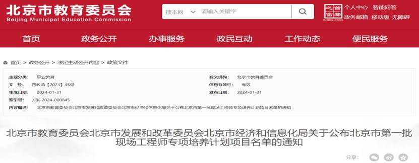 北京市第一批现场工程师专项培养计划项目名单的通知截图