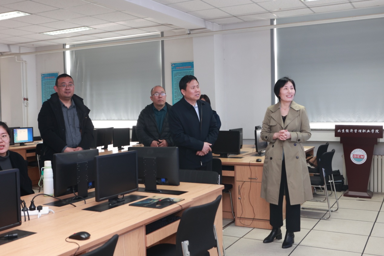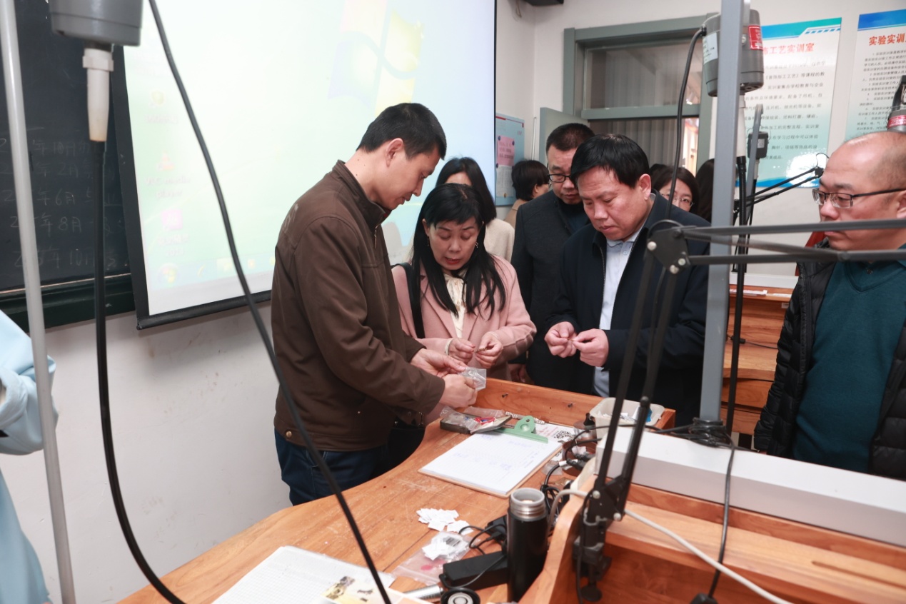 固安县融媒体中心党支部书记、主任李光辉,固安县文化广电旅游局局长刘冠英,固安县职业技术教育中心副校长周凤祥,国家级非遗柳编省级代表传承人张万富、省级非遗京绣传承人代海光、市级非遗固安香片传承人赵雪莹等一行人通过沙盘了解了园区建设规划,参观了bat365在线平台国际教育服务专业群、临空经济产业学院、珠宝科创产业学院、先进制造产业学院、智慧城市产业学院的钢琴、机场值机安检、形体礼仪、首饰制作、智能鉴定、玉雕、西门子PLC集成应用、数字化工业、智能控制、工业机器人、智能产线、数控技术、数字孪生、工业应用等实训室。各学院老师详细介绍了本专业产教融合培养模式、专业特色亮点、未来发展规划等情况。