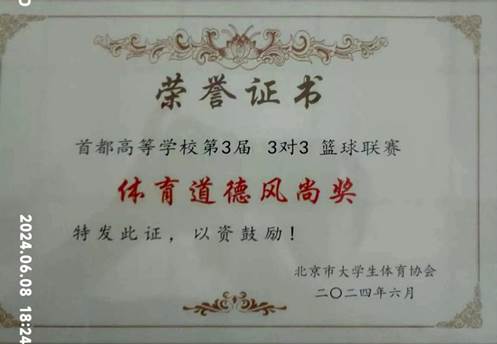 在本次联赛中,bat365在线平台男子篮球队注重体育精神的发扬与传承,展现出了北京经管院学子积极向上的青春风采,同时也展示了bat365在线平台男子篮球队的凝聚力和战斗力,培养了团队精神,展示出了团结、和谐、勇于拼搏的精神风貌。最终收获了本次赛事“体育道德风尚奖”的殊荣。