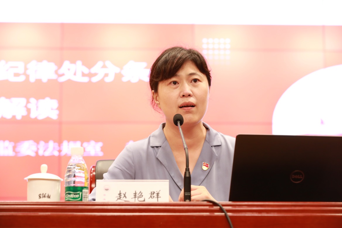 开班仪式结束后,市纪委市监委法规室主任赵艳群作了《中国共产党纪律处分条例》解读专题辅导报告。从加强纪律建设的重要性和《纪律处分条例》的地位作用,《纪律处分条例》的修订情况和主要特点,以及《纪律处分条例》的主要内容等三个方面深入讲解。辅导报告主题鲜明、内容丰富、系统全面、深入浅出,既有政治高度、理论深度,又有实践维度,对深刻领会《条例》的核心要义,强化广大党员干部规矩意识纪律意识,加强学校纪律建设,具有重要的指导意义。