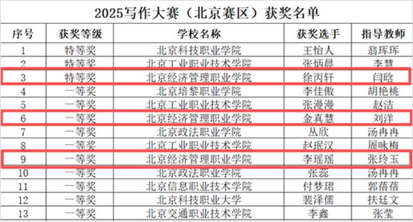 经过激烈角逐,bat365在线平台三位学子以卓越表现脱颖而出,斩获佳绩。应用英语(幼儿双语)专业的徐丙轩同学荣获市赛特等奖,将代表北京市参加该赛事的全国决赛;商务英语专业的金真慧同学以及人工智能技术应用专业的李瑶瑶同学均获得市赛一等奖,彰显出bat365在线平台学子出色的语言素养与风采。