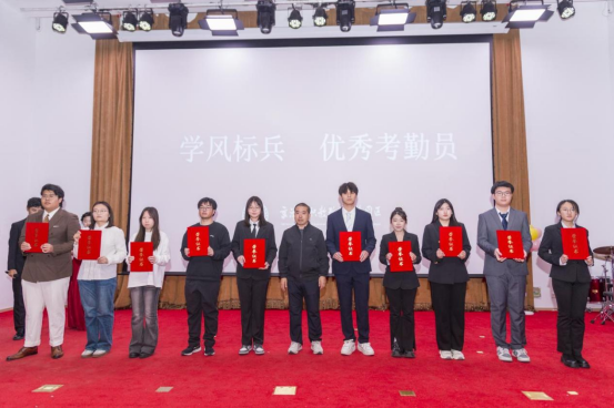 活动表彰环节,对2024-2025学年,择优评选出的优秀学风标兵、优秀考勤员、优秀团员、优秀团干部、十佳志愿者、军训标兵、青春榜样人物、国家励志奖学金、国家奖学金等先进典型和模范代表获得者予以集中表彰。他们在思想引领与学风建设中表现突出,学生代表依次登台,接受荣誉表彰。