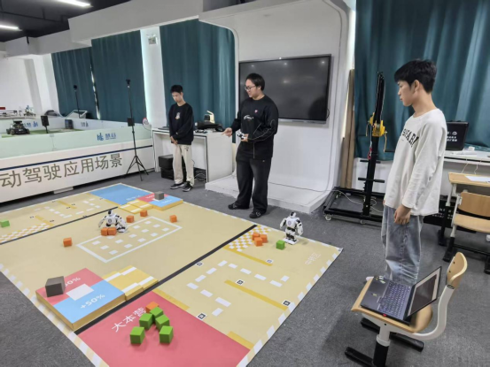 比赛现场,队员们沉着应战,在机器人协作搬运、路径导航、故障应急等关键环节展现出出色的技术稳定性。赛场之上,他们专注操作、默契配合,每一个指令的下达、每一次参数的调整都精准果断;指导老师在侧全程关注,及时给予专业指导,为团队保驾护航。