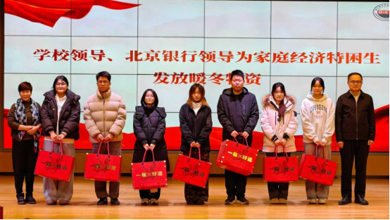 郑伟、周圆为家庭经济特困生代表发放暖冬物资,这份饱含关怀的物资让同学们在寒冬中感受到学校与社会的温暖。