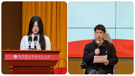 临空经济管理学院2025级专科生韩聪慧、京津冀职教改革示范园区2024级本科生王哲彦作为学生代表分别以《资助化雨润青衿——我的成长札记》和《坚韧为杖,资助为翼——我的逐梦之路》为题先后发言,他们对学校的深切关怀和北京银行怀柔支行的无私捐助表达了诚挚的谢意,同时分享了他们在国家、学校、社会等多方力量大力资助下的成长历程,朴实真挚的话语展现了当代青年自强不息、向阳生长的精神风貌。