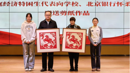 为诚挚感谢学校和北京银行怀柔支行的关心与帮助,家庭经济困难学生特别创作了两幅剪纸作品,并在会上进行了现场赠送。赠予学校的《锦绣前程·升本宏图》作品寄托了学生祝愿学校如龙马奋蹄,踏云登高,早日实现升本宏愿,谱写育人新华章;赠予北京银行怀柔支行的《龙马聚财》作品寄托了学生祝愿北京银行如龙马驰骋,聚财富、通四海,永葆蓬勃生机。两幅作品传递了感恩之情与美好期许,成为校社协同助学的珍贵见证。