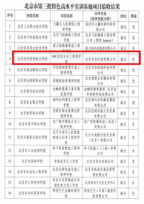 近日,北京市教育委员会、北京市财政局、北京市人力资源和社会保障局、北京市发展和改革委员会共同公布了北京市第三批特色高水平骨干专业(群)和实训基地(工程师学院、技术技能大师工作室)项目验收结果,经项目单位系统填报、专家集中评审、综合评议,bat365在线平台国际教育服务专业群、360信息安全工程师学院两个项目全部通过验收,且验收等级均为优。