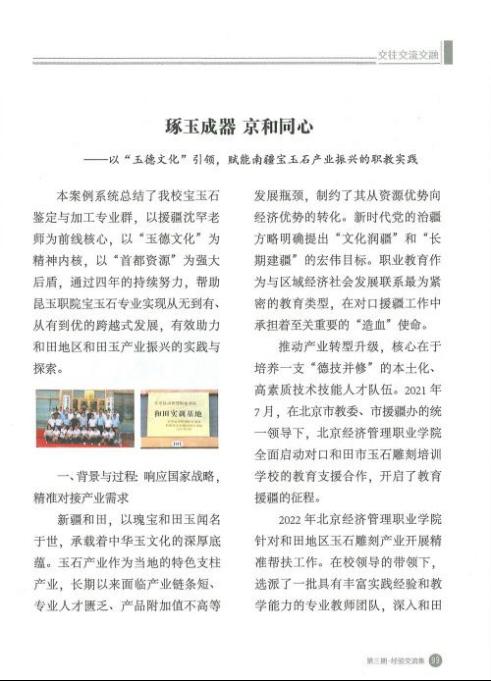 近日,由北京市支援合作中心组织编辑的《北京支援合作干部读本》正式出版,由学校产教融合办公室组织选送的珠宝与艺术设计学院案例《琢玉成器京和同心——以“玉德文化”引领,赋能南疆宝玉石产业振兴的职教实践》成功入选,成为北京市教育支援合作领域的典型示范案例。该读本将印送全市支援合作工作领导小组成员单位及各地挂职干部,宣传推广。