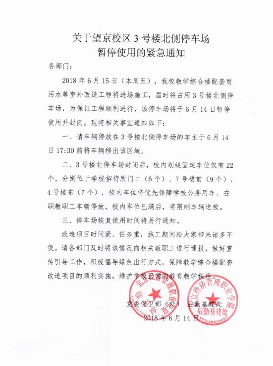 关于望京校区3号楼北侧停车场暂停使用的紧急通知