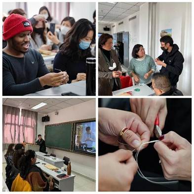 此次活动特邀东方艺珍花丝镶嵌厂项目传承人主讲,老师们为留学生介绍了花丝镶嵌的历史、文化内涵,进行了现 场展示,并指导留学生动手体验。各国留学生为老师们巧夺天工的技艺和精美绝伦的作品折服并不断发出感叹。在体验环节,大家热情高涨,一边用汉语与老师交流,一边动手操作。当一个个完整的作品展现在眼前时,学生脸上满是创作后的兴奋与喜悦。
