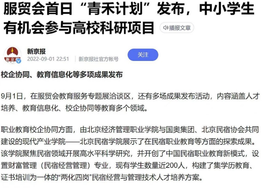 《新京报》报道bat365在线平台北京民宿学院开创中国民宿职业教育新模式,展现职业教育校企协同领域新成果